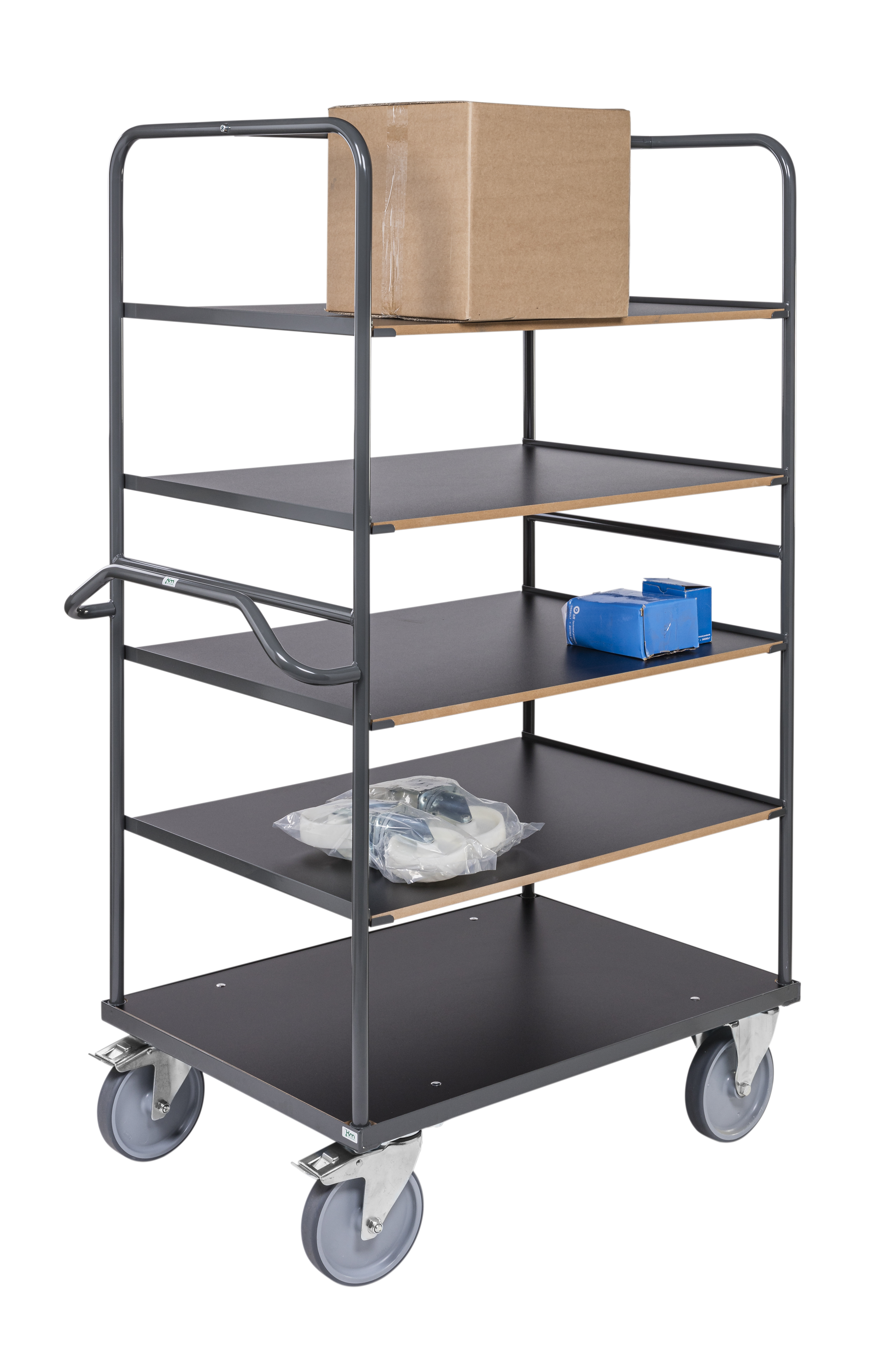 Gepoedercoat met MDF-plaat. Niet-afgevende zwenkwielen. 5 planken. Afstand tussen planken: 300 mm. Capaciteit plank: 100 kg. Hoogte Handgreep: 1040 mm. Wielen: 2 vaste wielen 2 zwenkwielen met rem. Diameter wielen: 200 mm.